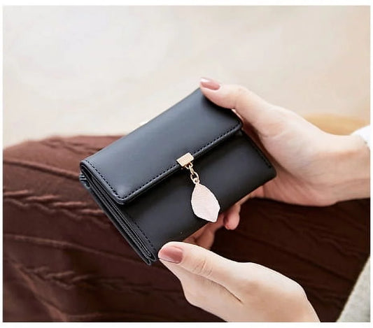 Small Wallet for Women PU Leather RFID Blocking Coin Purse Card Holder Trifold Ladies Purse Leaf Pendant(Black)