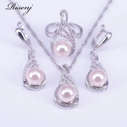 Pink Freshwater Pearl Silver 925 Jewelry Set White Zircon Costume Jewelry Set for Women Earrings Ring Necklace Set Free Shipping