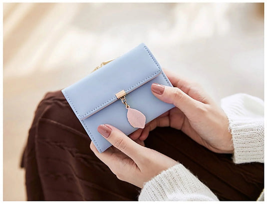 Small Wallet for Women PU Leather RFID Blocking Coin Purse Card Holder Trifold Ladies Purse Leaf Pendant(Light Blue)